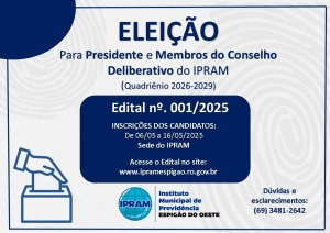A Comissão Eleitoral, nomeada pela Portaria nº. 753/GP/2025, torna público a abertura de processo eleitoral, conforme Edital nº 01/2025, para a eleição de Presidente e membros do Conselho Deliberativo do Instituto de Previdência Municipal de Espigão do Oeste – IPRAM para o mandato de 2026-2030.